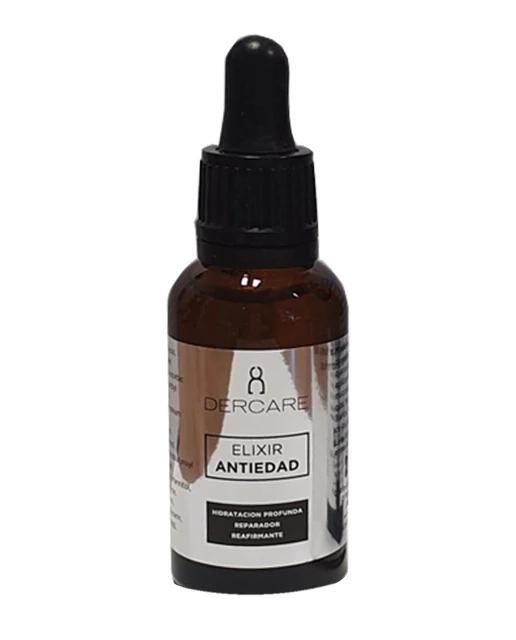 El Elixir Antiedad Dercare está formulado con ingredientes de alta calidad, incluyendo ácido hialurónico, colágeno hidrolizado, dos tipos de vitamina C pura y vitamina E. Este elixir ofrece múltiples beneficios, tales como ayudar a reparar los daños causados por la oxidación de radicales libres, reparar la elastina y el colágeno, y tensar la piel produciendo un efecto "botox" de manera natural. Además,hidrata profundamente la piel, corrige la flacidez reafirmando la piel, actúa como regenerador celular, mejora y corrige las células, regula la producción de sebo y minimiza los poros.